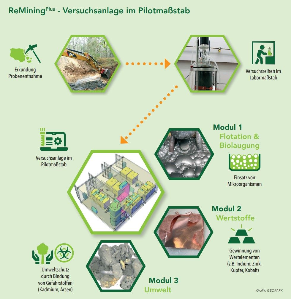 Im Zuge von ReMiningPlus erfolgt mittels Versuchsanlage im Pilotmaßstab die Wertelementgewinnung (In, Zn, Pb, Cu, Co) aus dem Haldenmaterial, sowie die Nutzung weiterer inerter Bestandteile (z.B. als Baustoff). Die Beseitigung/Immobilisierung der vorhandenen Gefahrstoffe wird im Umweltmodul 3 realisiert.